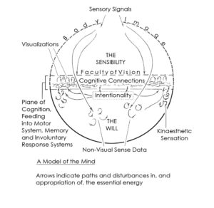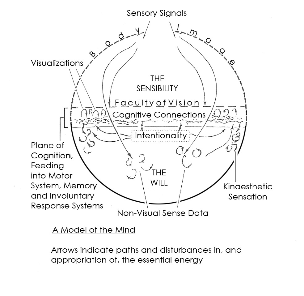 In attempting to understand the flow of energy within the mind, one can make an analogy with a liquid in a tank. Non-visual sensory signals penetrate the body of the ‘liquid’ – though not, in this model, through the surface – and generate disturbances, or kinaesthetic sensations. The disturbances surface in a ‘welling up’ effect that is the initial process of cognition, and visualisations result. The visualisations occur at the interface with the transcendental dimension, which also serves as a conduit for direct visual data. The surface of the liquid characterises the ‘plane of cognition’. ‘Cognitive connections’, across it, are mental associations. All that is appreciable at the plane of cognition, and nothing more, is recorded in the pure memory. The model of the mind is illustrated in the diagram.